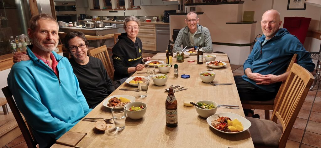 Für den Freitag 06.02. sagte der WB nur Regen voraus. Der Entscheid, an dem Tag nicht mehr zu Laufen, und erst gegen Abend ins Quartier zu fahren, fiel leicht. Apropos Quartier. Stefan hatte aus seinem Fundus den Reiterhof in Gaicht aufgetan. Für uns sieben – der Andy musste leider dann doch passen – eine mehr als geräumige Bleibe: ein ganzes Haus mit Ferienappartments zum Selbstversorgen – mit Chefeinkäufer Stefan. Durst und Hunger litten wir NICHT!